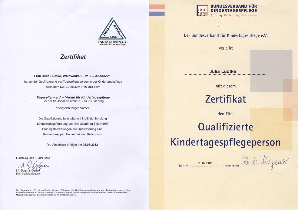 Meine Pflegeerlaubnis habe ich im Dezember 2008 erhalten und sie wurde im Dezember 2013 um weitere fünf Jahre verlängert. Diese Erlaubnis befugt zur Betreuung von fünf Tageskindern zeitgleich. Insgesamt darf ich acht Betreuungsverträge abschließen. Selbstverständlich habe ich auch einen " Erste Hilfe Kurs am Kind " absolviert.